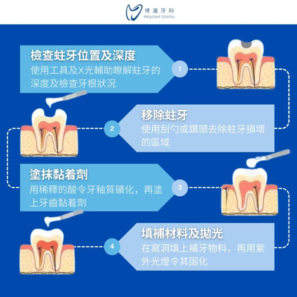 在窩洞填上補牙物料,再用紫外光燈令其固化。填補完成後的牙齒還需經過修磨,確定不影響咬合且不會過度集中受力後,即可進行拋光,維持牙齒表面平整,以減少牙菌斑附著及染色問題。